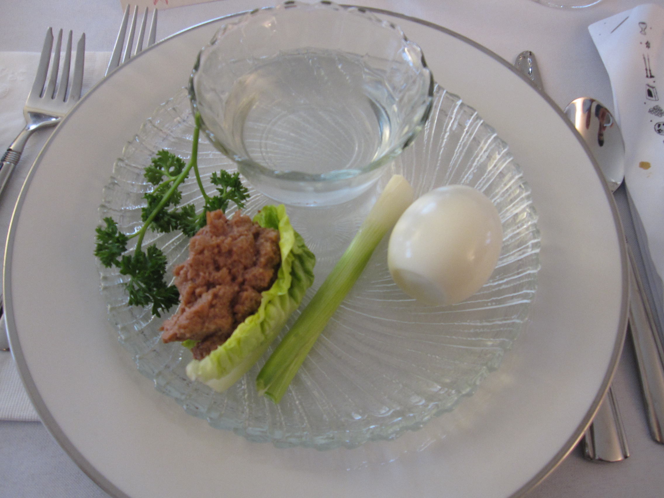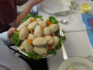 The first thing that get’s passed around is Gefilte Fish. It’s basically a classic Eastern European fish dumpling made out of whitefish and pike. It’s eaten with horseradish.