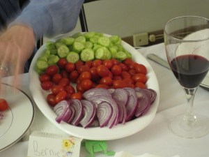 Then some fresh vegetables. Cucumbers, tomatoes, and red onions.