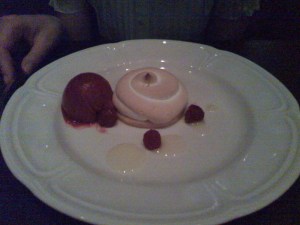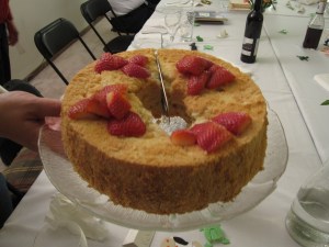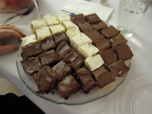 Dessert consists of various cakes made with matzah meal flour and fresh fruit. Chocolate cake with raspberries, strawberry shortcake, brownies, carrot cake, grapes and strawberries.