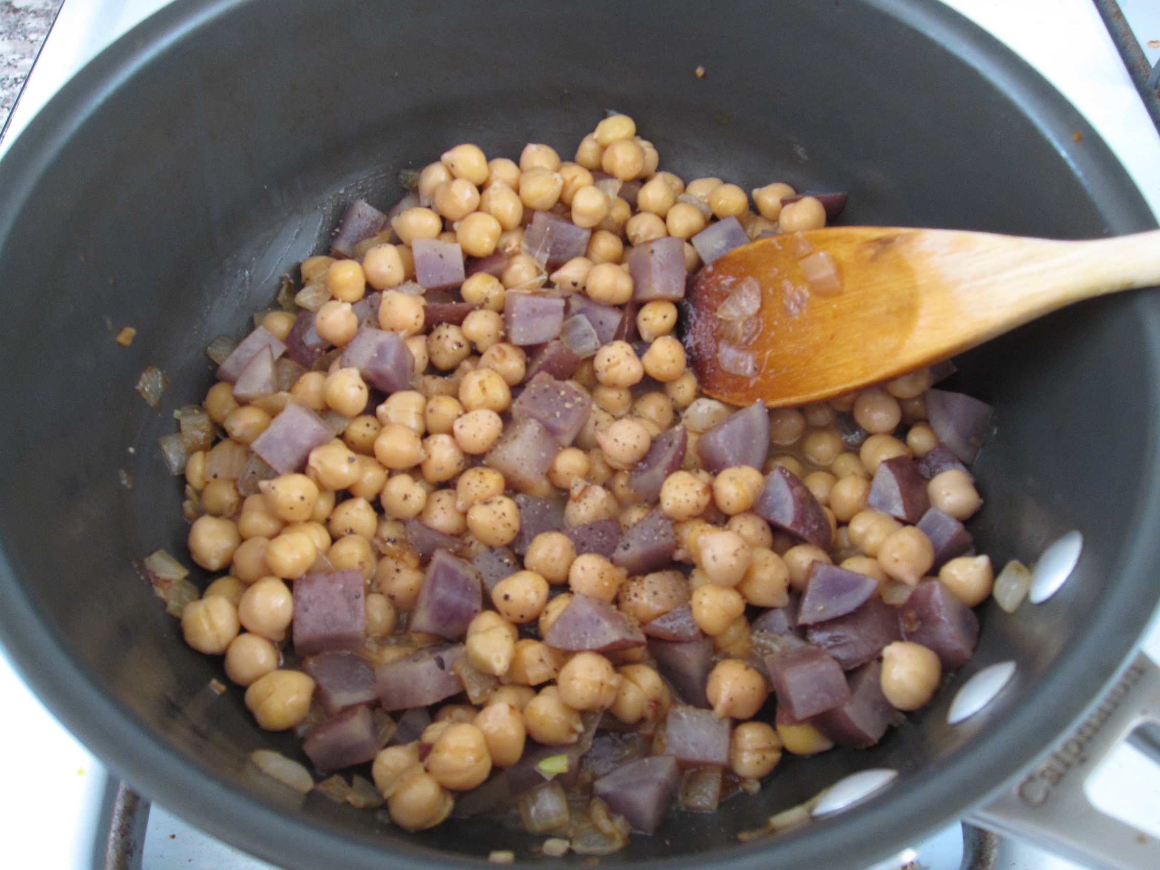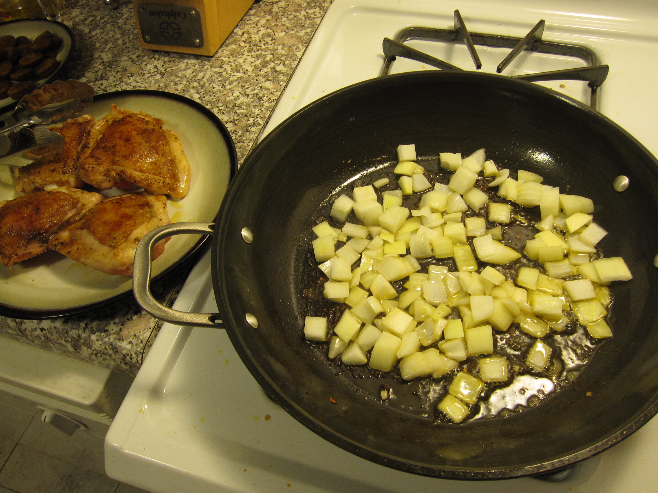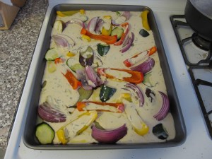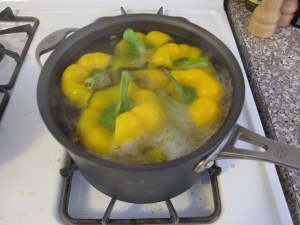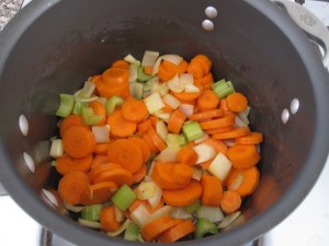 For the soup, I started by sweating down half an onion, a carrot, and a rib of celery (all chopped) in some olive oil. After about 7 minutes I tossed in 2 crushed garlic cloves. A couple of minutes later I added a half of a yellow bell pepper chopped. I let that all sweat out for a few more minutes.
