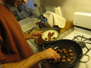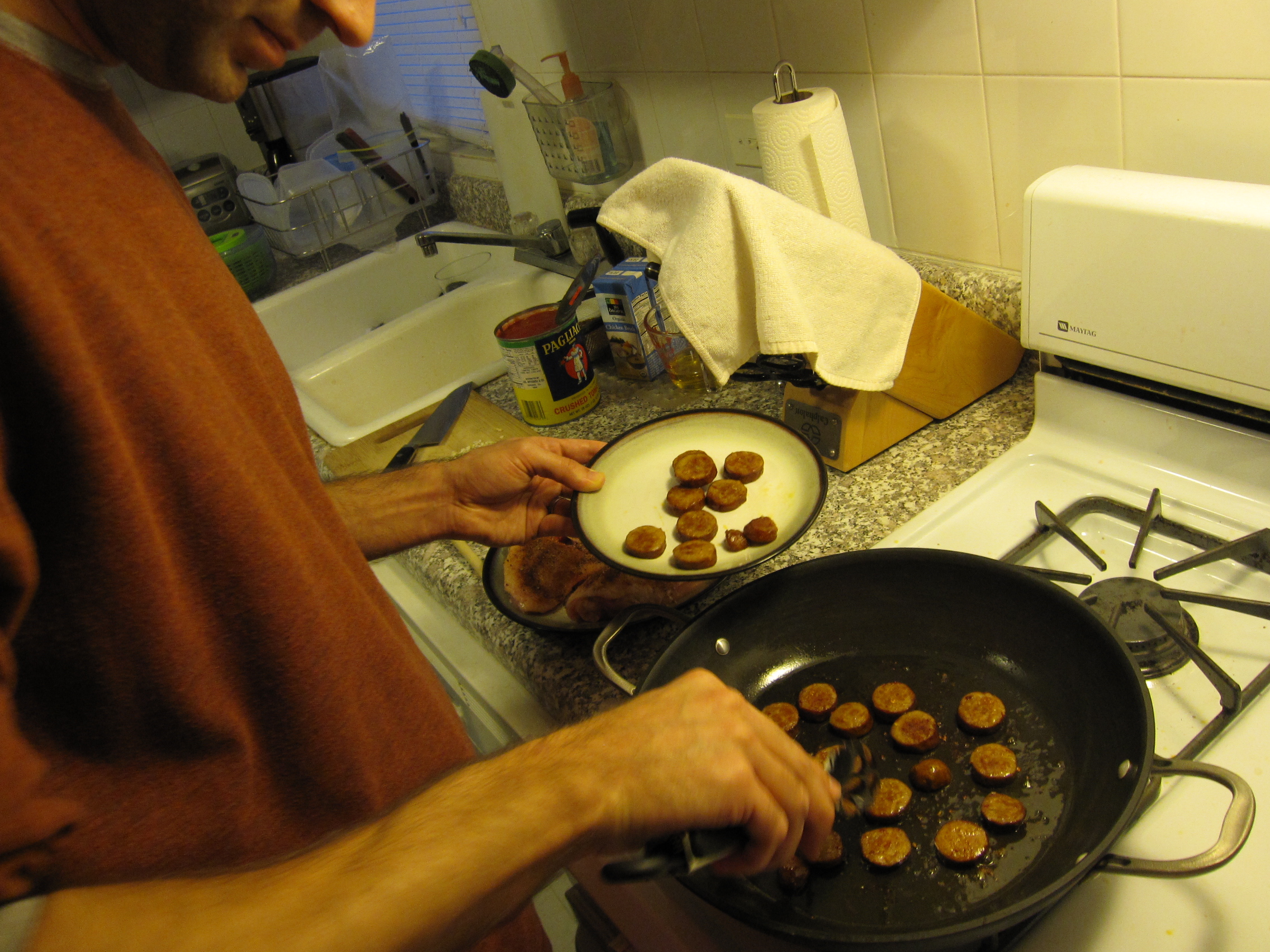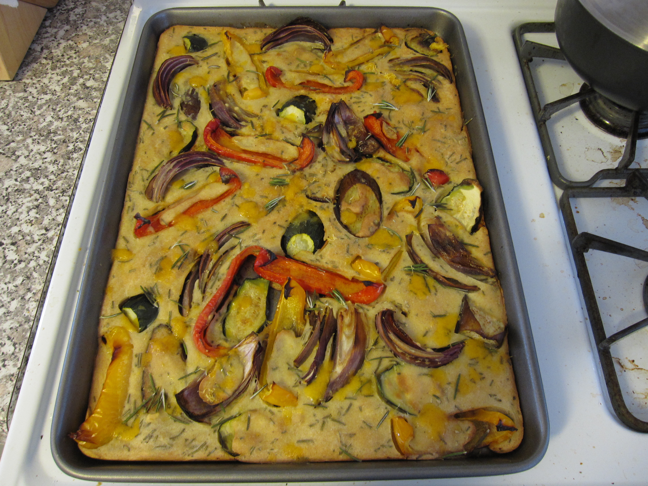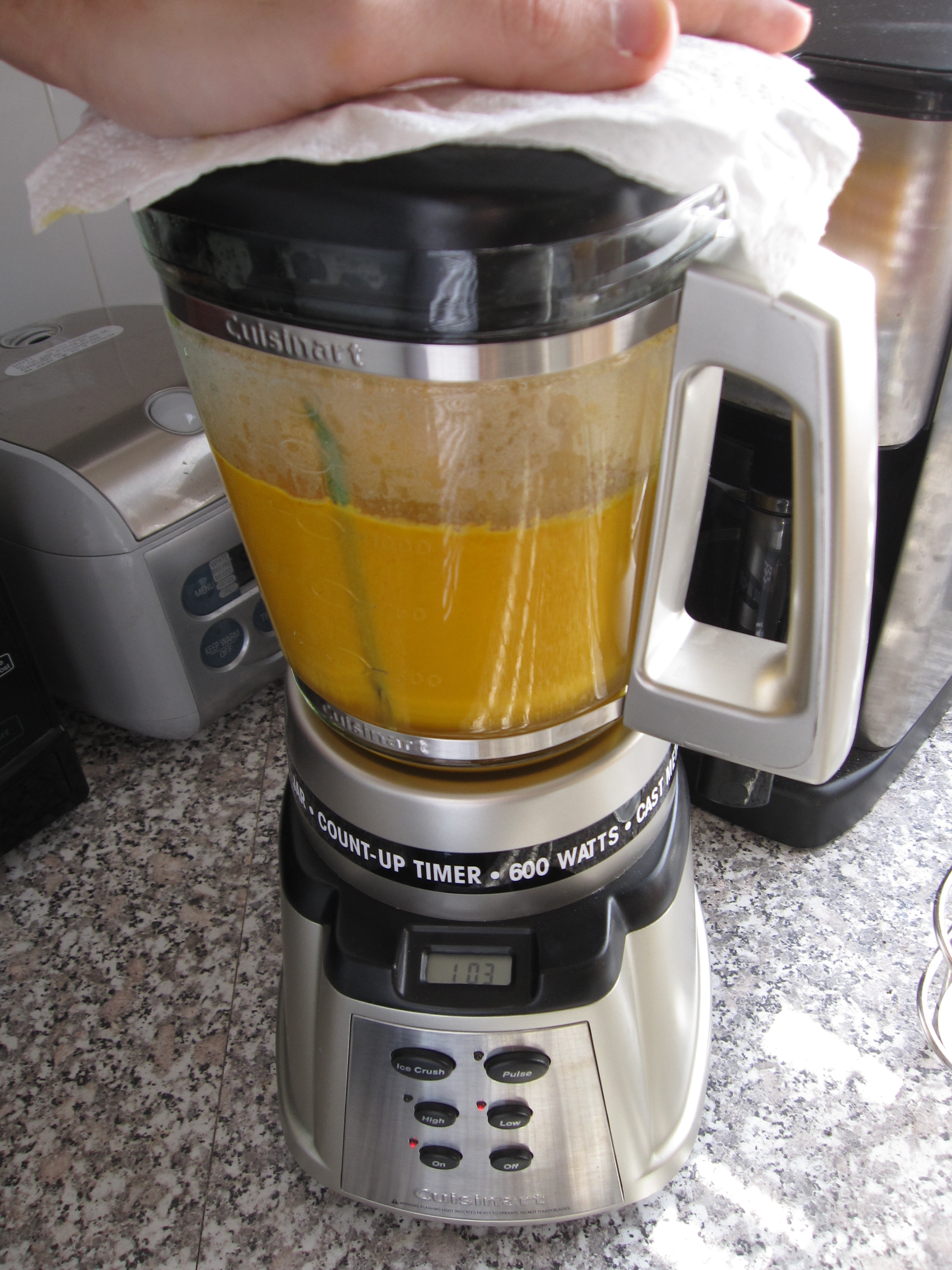 For the soup, I started by sweating down half an onion, a carrot, and a rib of celery (all chopped) in some olive oil. After about 7 minutes I tossed in 2 crushed garlic cloves. A couple of minutes later I added a half of a yellow bell pepper chopped. I let that all sweat out for a few more minutes.