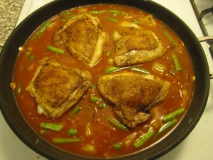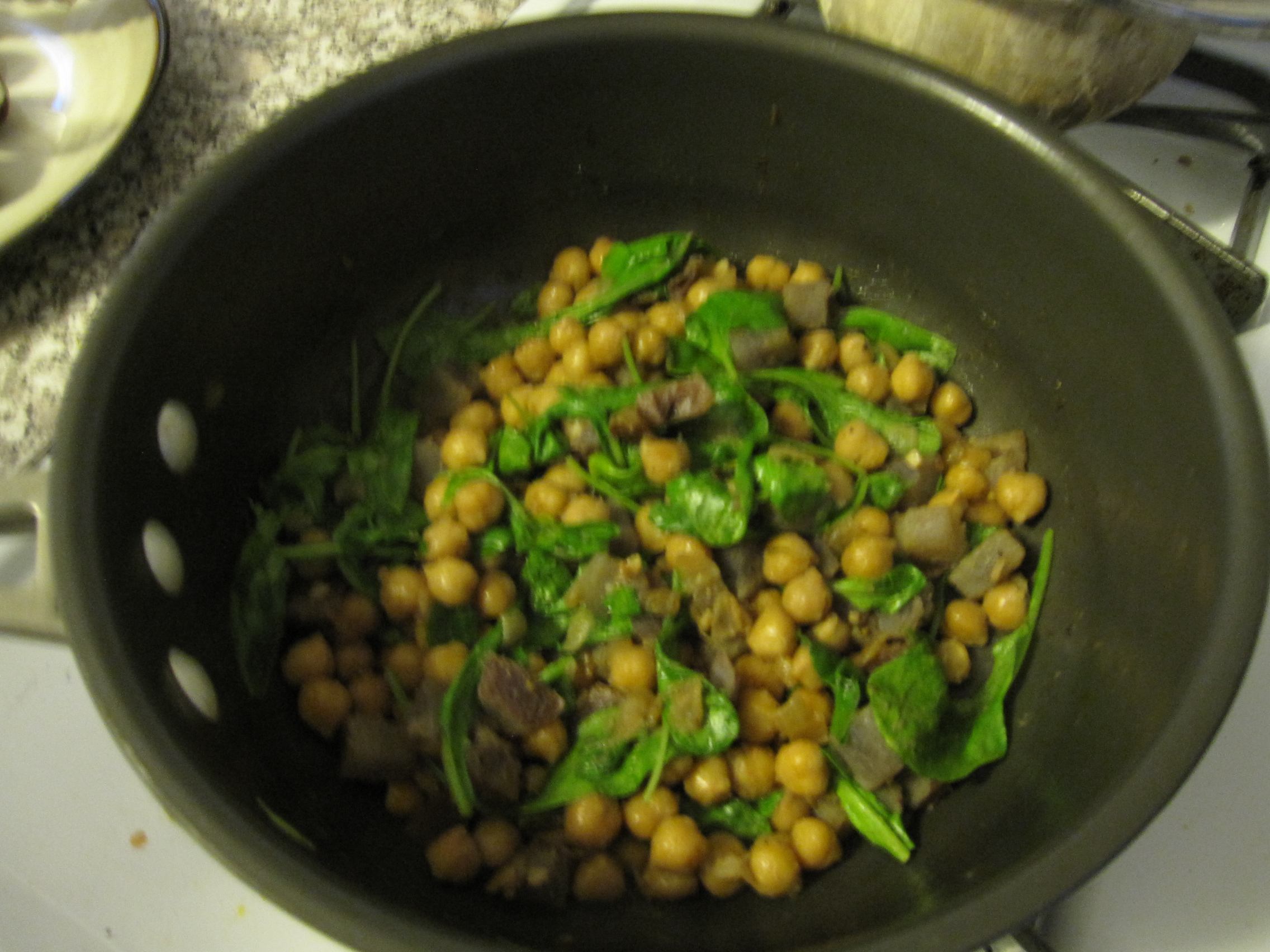 Then I dumped in one 14oz can of diced tomatoes (no salt added), one cup of chicken stock, and 1.5 cups of water. I stirred that all around and seasoned with some salt. There was a Parmigiano Reggiano rind in my cheese drawer, I try not to through them away once the grateable part of the cheese is used for reasons like this, so I dropped that in as well. By doing so a subtle sharpness is added to both the taste and aroma, you can tell there’s Parmigiano in there. Once that started to boil I covered the pot and simmered over a med-low heat for about 20 minutes.