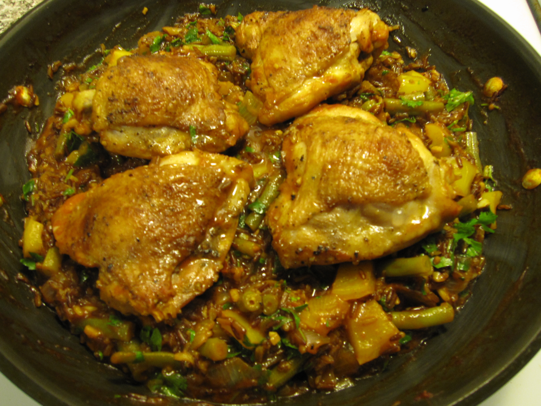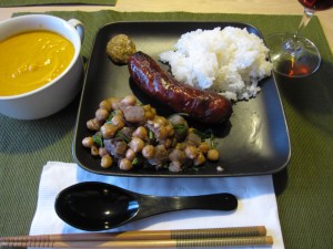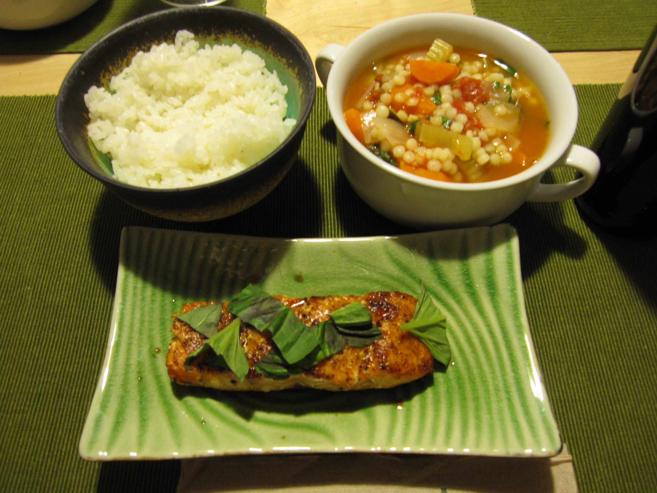 To serve, I drizzled a little balsamic vinegar on the salmon and garnished with some fresh basil. I also sliced up a handful of basil and added it to the soup along with some black pepper just before serving. White rice was also on the menu.