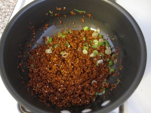 I started by tossing the ginger and garlic into a hot pan with 2 tablespoons of sesame oil and 2 tablespoons of soy oil. I let that go for just a few minutes until it became fragrant.