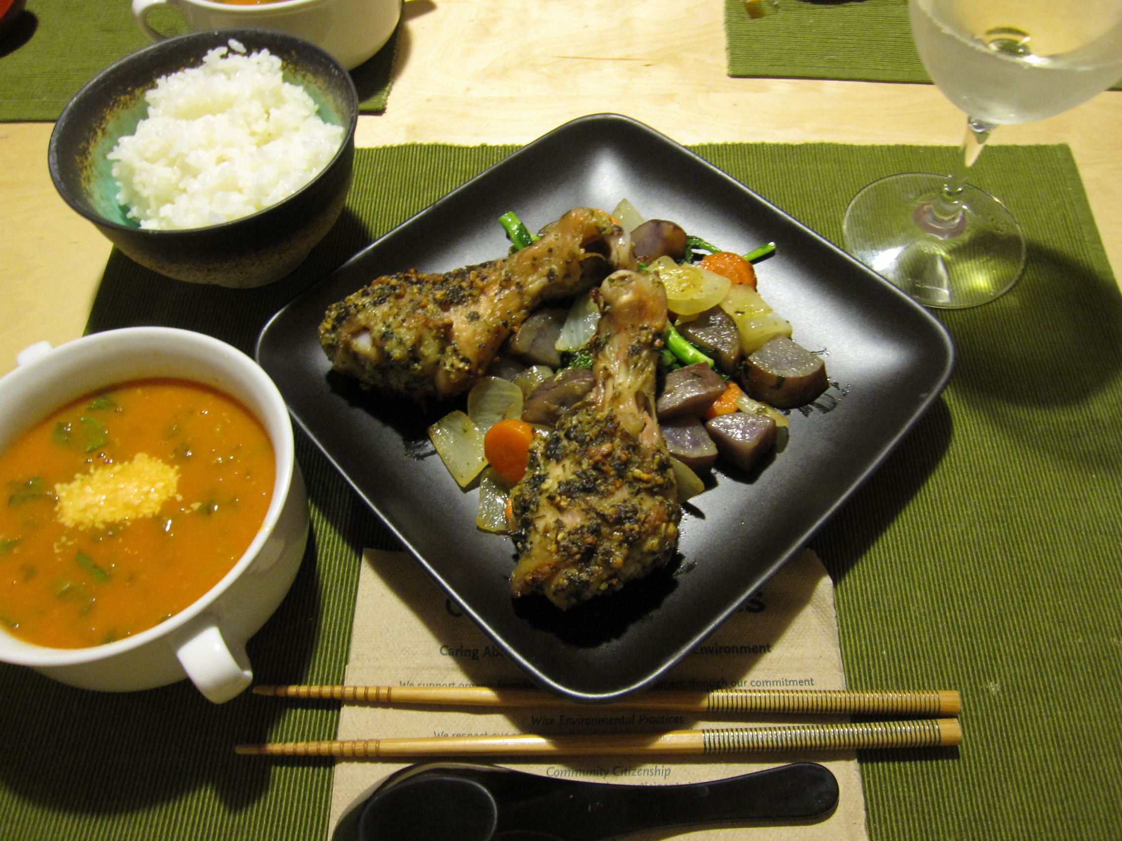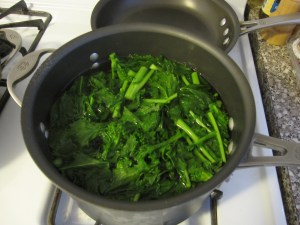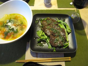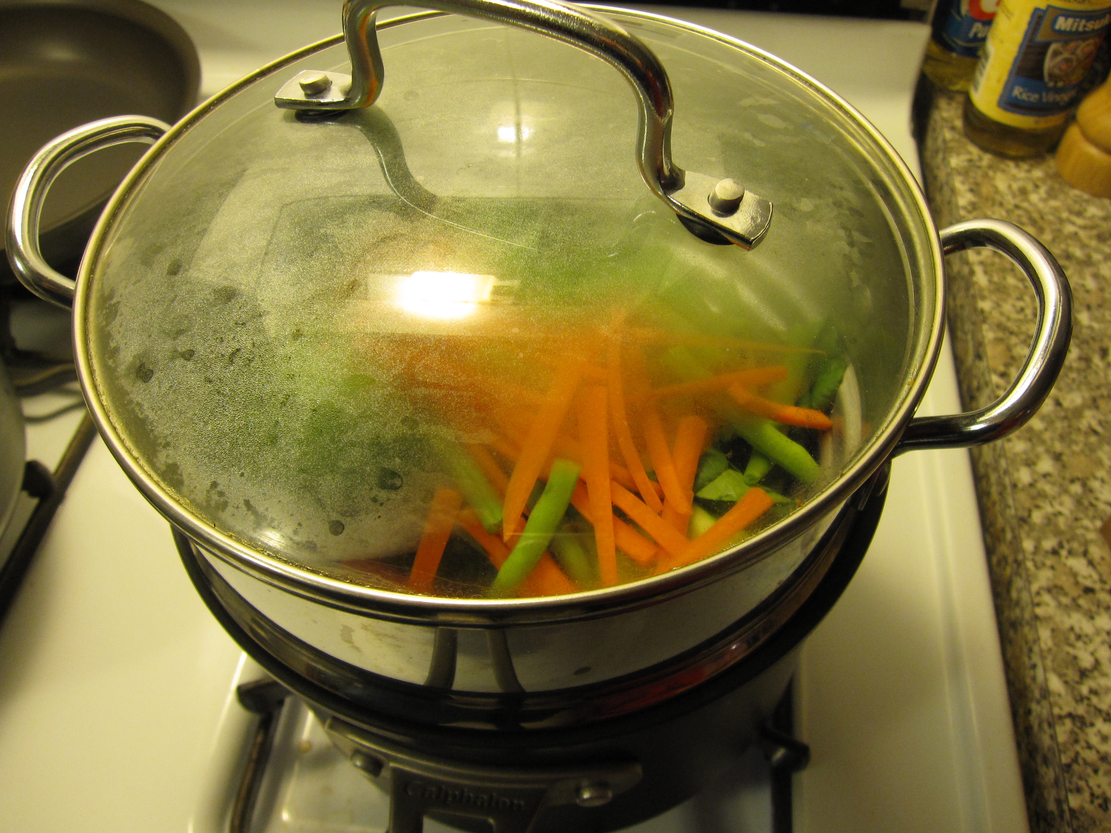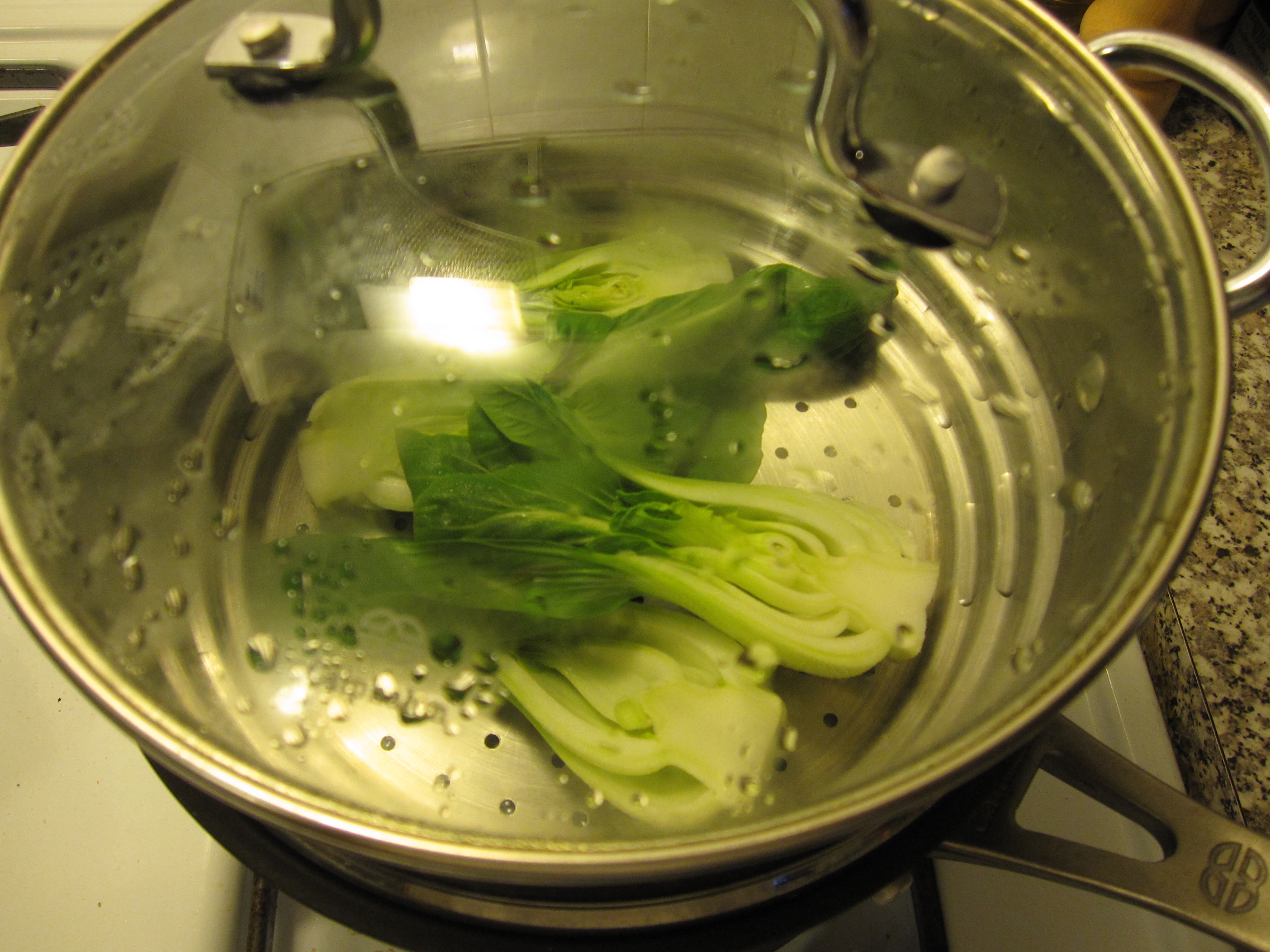 While the sauce was thickening I put a couple of baby bok choy that I had cut in half into the steamer. I let them steam for about 6 minutes. They were served next to the shogayaki with some white rice.