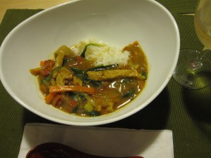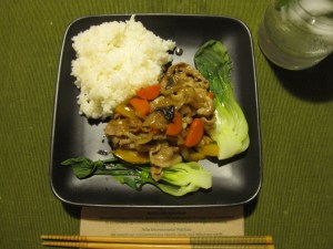 Then I dumped in the sauce along with some black pepper. I covered the pan and turned the heat down to medium once the sauce started to boil a little. Every few minutes I stirred everything around. After about 15 minutes I uncovered the pan and let the sauce reduce a little. I served it once the pork and vegetables were evenly coated by the slightly thickened sauce.