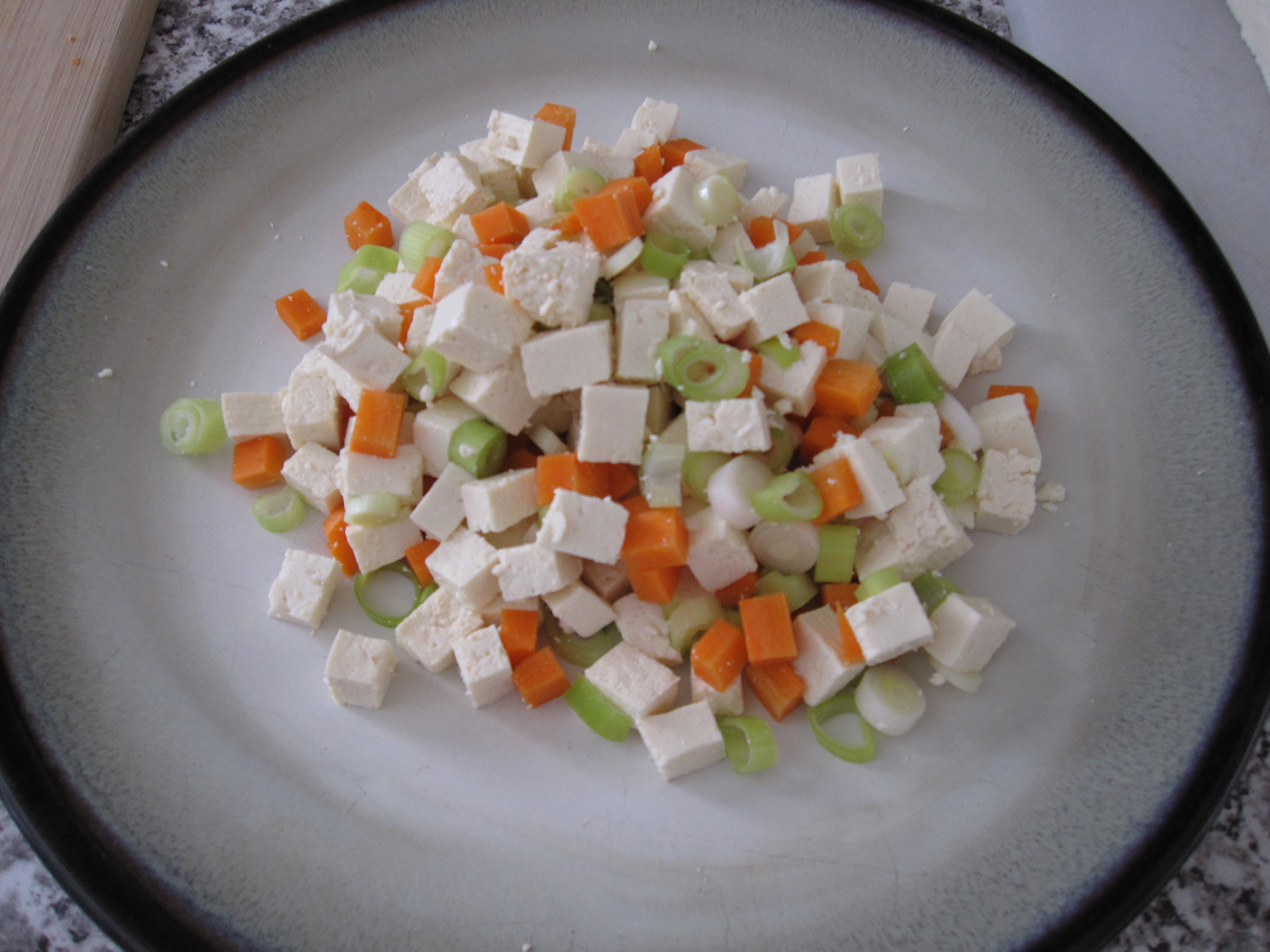 For vegetables I sliced half an onion, cut a carrot into half moons, sliced half of a yellow bell pepper, and slices a bunch of mushrooms.