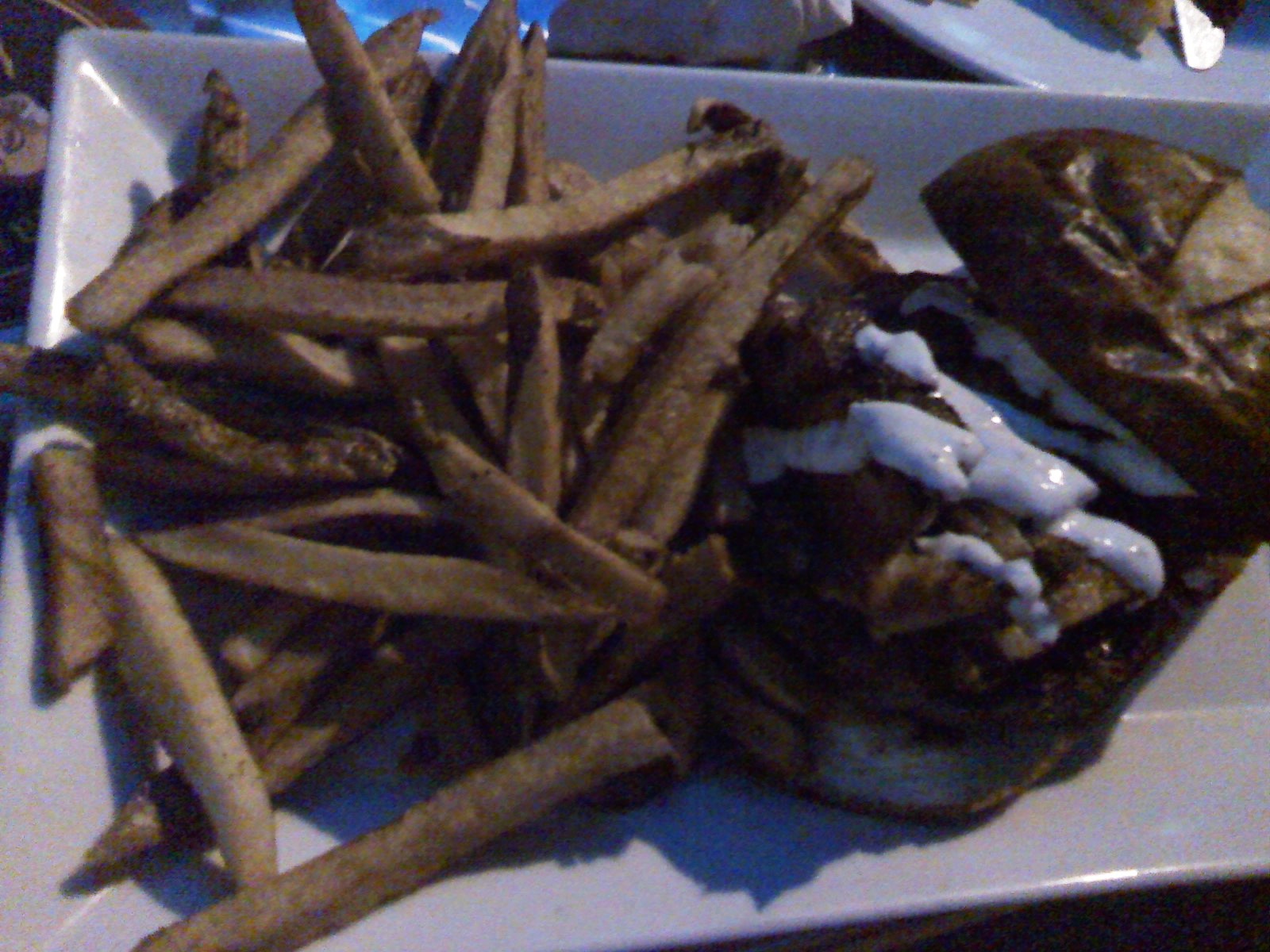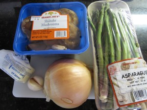 In a medium-hot pan I poured in a couple of tablespoons of peanut oil. I sweat down the onion for about 7 minutes. Then I added the garlic and shiitake. I let those cook for about 5 minutes before tossing the asparagus in. Another 8 minutes and I added the butter and soy. I let it all cook together for a few more minutes. so the butter could coat everything, then served it up.