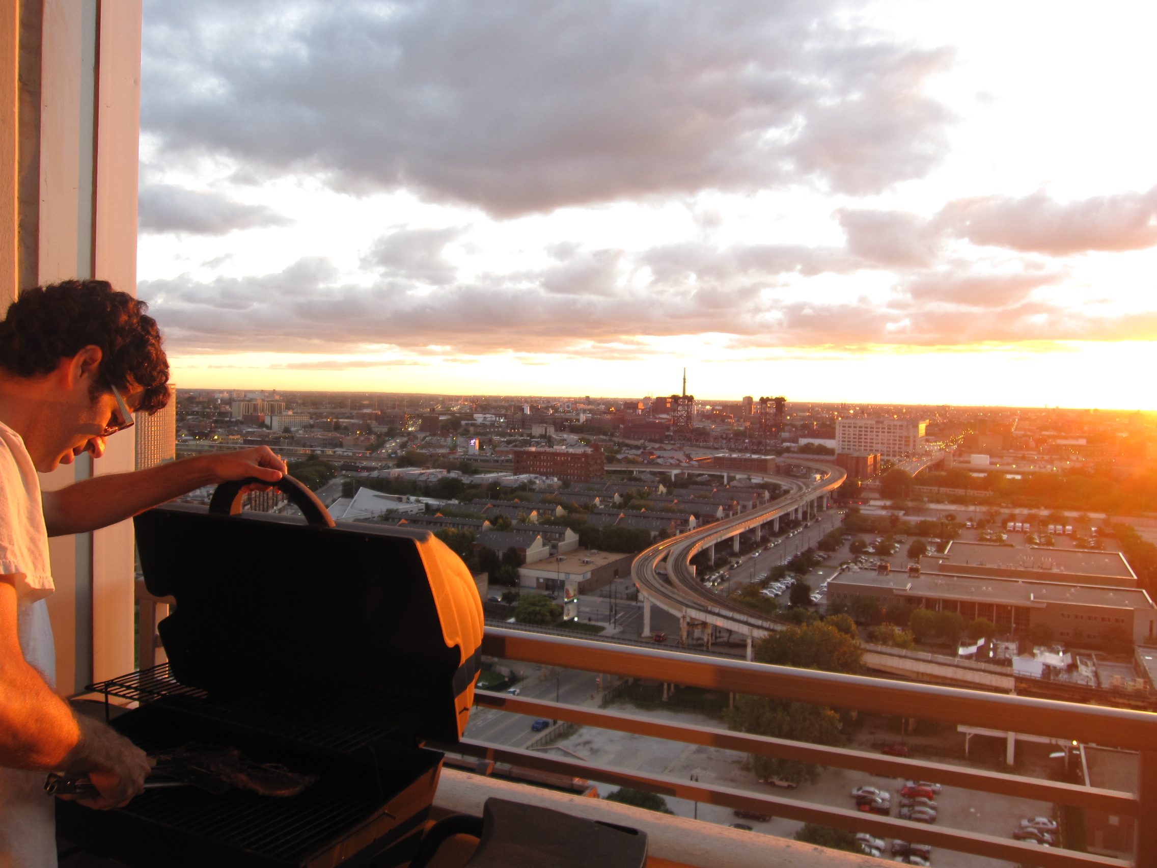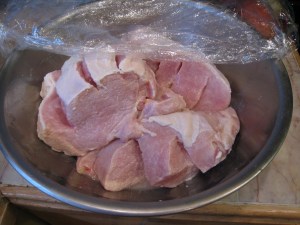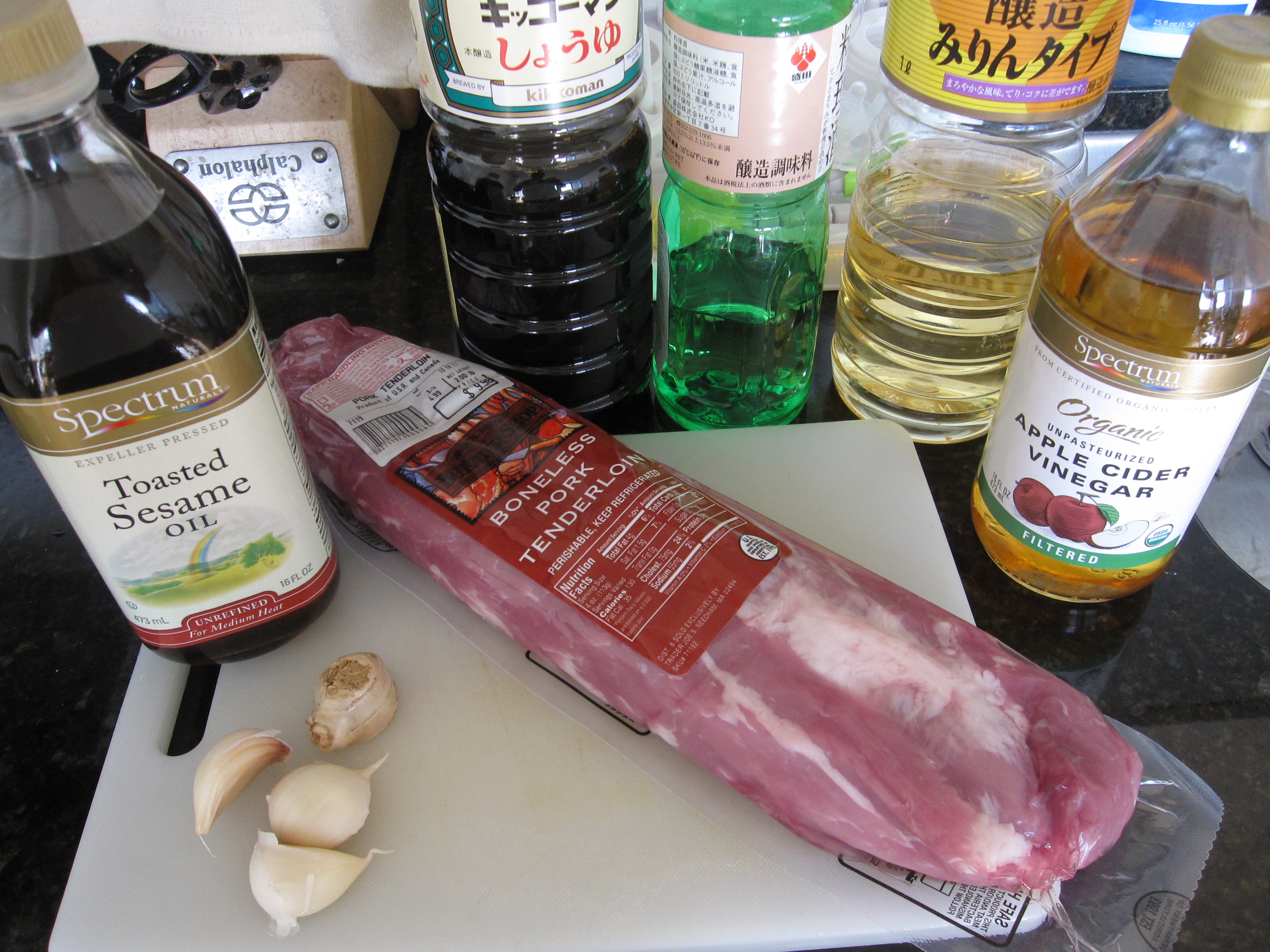 While the squash was simmering I marinate the pork in 1 tablespoon sesame oil, 3 tablespoons soy sauce, 2 tablespoons sake, 1 tablespoon mirin, 2 tablespoons apple cider vinegar, 1/2 inch of ginger grated, and 3 garlic cloves grated. I had 2 lbs of tenderloin and let it marinate in the fridge for about 2 hours, then let it sit out for about 45 minutes before grilling.