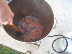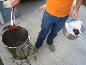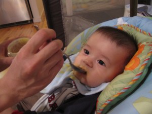 The night’s triumph, however, was that it was Otis’s first successful adult food feeding! We tried some sweet potato a couple of weeks ago, but it didn’t go over so well. He just wasn’t quite ready. With all the butternut squash puree, we gave it another shot. Remember the puree that I set aside before adding salt and pepper? (babies shouldn’t eat added salt) I mixed in about 2 oz’s of breast milk, not from my breasts or he’d get nothing but a hairball, until it was really smooth and thin enough that he could just swallow it down. Sure, his bib got fed too, but he ate the whole thing. I’m sure I’ll have a fun mess to clean up today because of it. But he’s worth it.