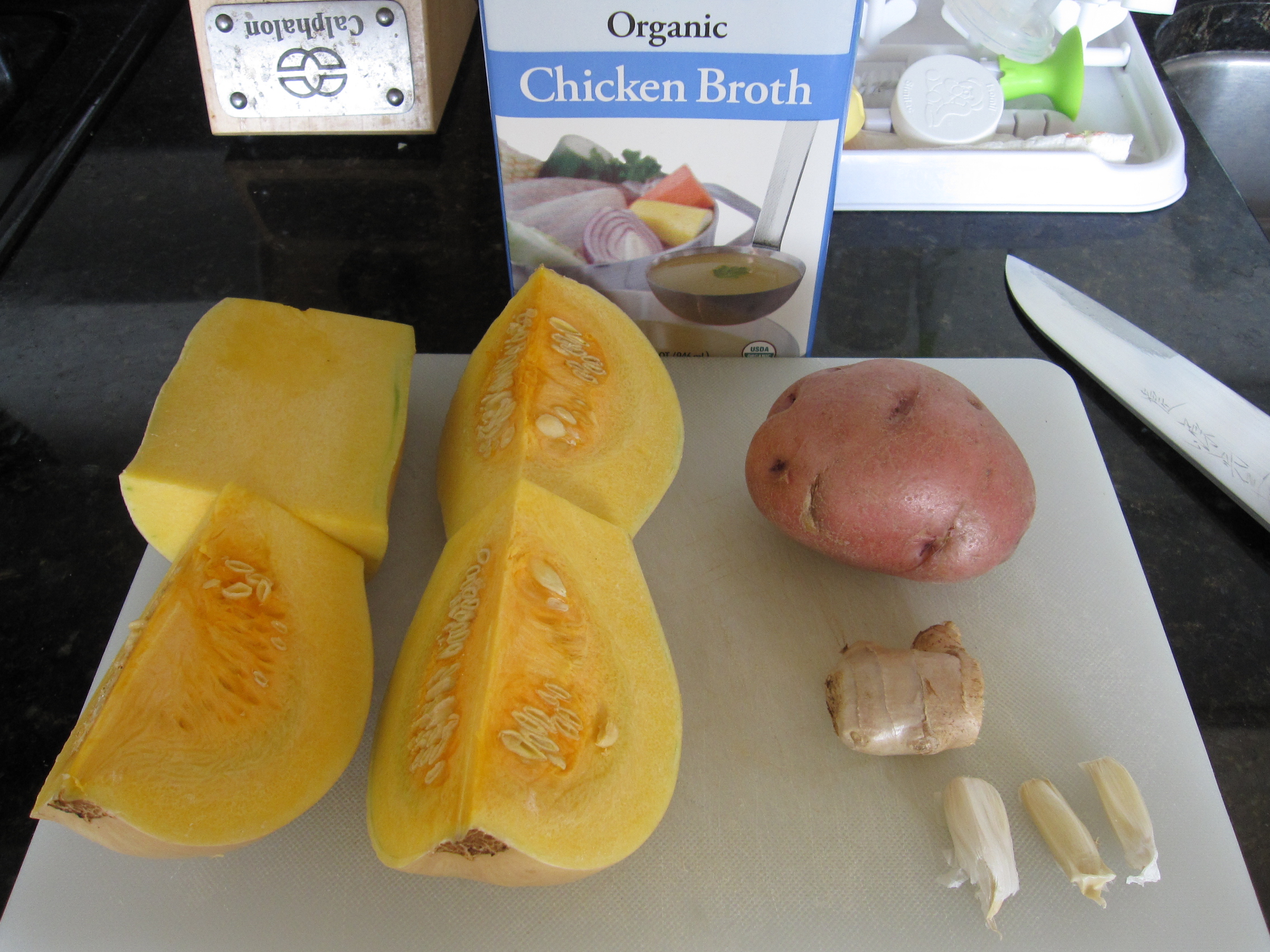 Making a puree out of squash is one of the easiest things you can do. I took the squash and removed the seeds and skin then chopped it up. Along with that, I skinned and chopped one medium red-skin potato, 1/2 inch of ginger, 3 garlic cloves, and 1/4 cup of chicken stock. The potato is simply to add a nice smooth texture.