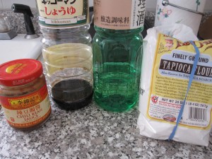 The daikon kimchi takes 24 hours so I had to start the Sunday. The ingredient list includes a lot of kosher salt (sea salt can be used also), 1.5 tablespoons of toban djan (I didn’t have any Korean chili paste, toban djan is Sichuan, but it is similar enough to work), 1/4 onion small diced, 1 garlic clove minced, 1 lb daikon cut into 3/4 inch cubes, 1 teaspoon fish sauce, 1 teaspoon sugar, and 2 green onions thinly sliced.
