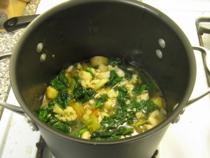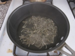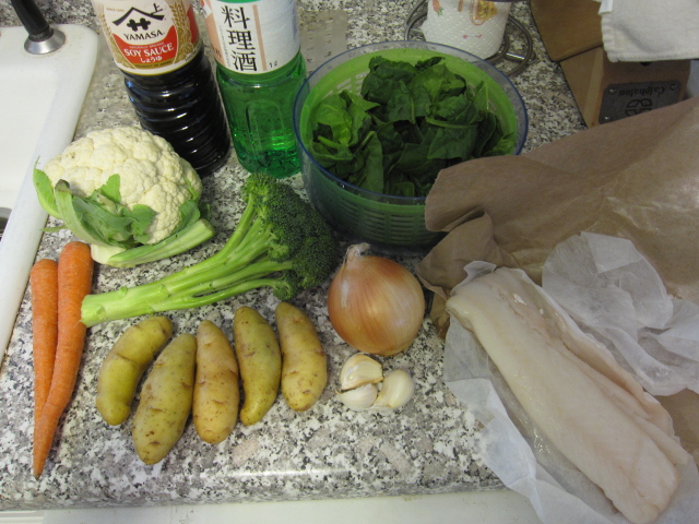 In this box there was some simple steamed pea pods, shiitake simmered in shoyu (Japanese soy sauce), boiled satoimo potatoes, simmered lotus root, simmered carrots, and koya tofu (freeze-dried tofu, something I’ve never eaten before but really like the texture).
