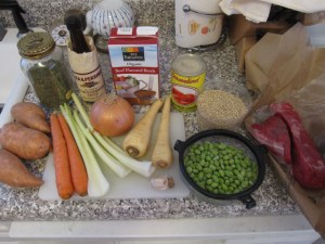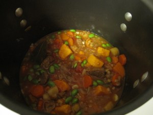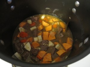 I made the brisket in the morning to make sure it got enough time in the braising liquid. I used 2 cups of beef stock, 1 cup of red wine, 1/2 cup of prepared horseradish, 3 carrots chopped, 3 celery stalks chopped, 7 garlic cloves minced, 1 small onion sliced, and a 3.5 pound brisket.
