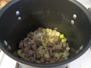 In a large heated skillet I poured in a couple of tablespoons of vegetable oil and browned the brisket. I gave each side about 7 minutes.