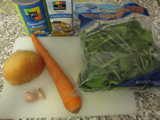 I made the soup first since I could just re-heat it when the spaghetti was ready. I used 1/2 an onion sliced, 2 garlic cloves chopped, 1 carrot chopped, 1 can of cannellini beans rinsed and drained, 1 cup of chicken stock, and a large handful of baby spinach.
