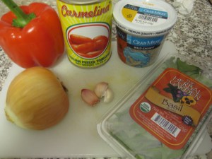 The spaghetti was real simple as well. I used 1 red bell pepper chopped, 1/2 onion chopped, 1 14oz can of Italian peeled tomatoes, 1 8oz container of blue crab meat, 3 cloves of garlic chopped, and 3/4 oz of basil.