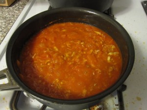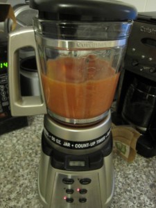 I threw the onion, tomatoes, and garlic and into my blender. I filled the tomato can about half-way with water and added that as well along with a few red pepper flakes. I let it go until I had a smooth tomato sauce.