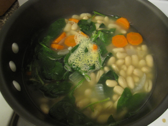 Real simple, I poured the stock in a soup pan and added the onion, carrot, and garlic. I brought it to a boil, turned the heat down, and let it simmer for about 10 minutes. Then I added the beans and spinach and turned off the heat. The beans and spinach don’t need to be cooked so I could just let them heat up when I re-heated the soup. Before serving I seasoned with salt and pepper.