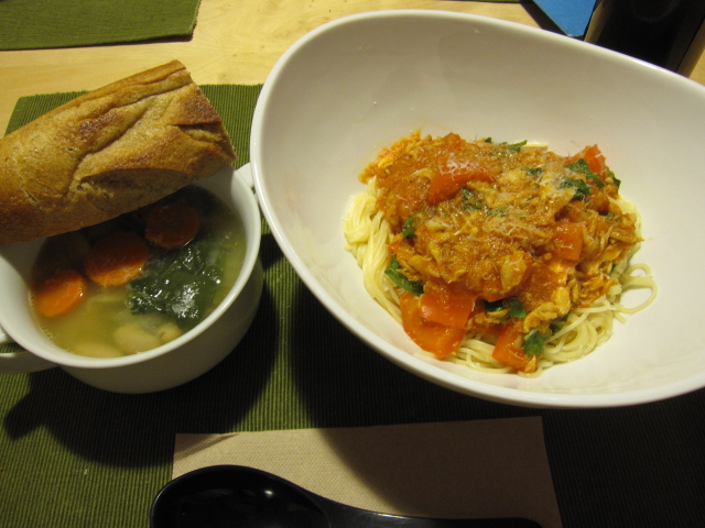 In a pan I heated up about 1 tablespoon of olive oil and sautéed the red pepper for 5 minutes. Then I poured in the tomato sauce and let that come up to a boil. Once it started bubbling I turned the heat down and let the raw onion and garlic in it cook out for about 10 minutes. While that was going on I picked through the crab meat to make sure all of the shells had been removed and then added it to the sauce with all of its juice. I cooked some spaghetti noodles according to package instructions, heated up the soup, seasoned the crab-tomato sauce with salt and pepper and added the basil, and then served it all up.