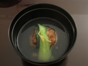Then, she brought out bowls of soup. A clear broth made from kombu and katsuo-bushi (bonito flakes) filled with mitsuba greens, fish cakes with good fortune written in the middle, mochi (an absolute necesity at the Japanese new years table), shiitake, and slices of yuzu peel.