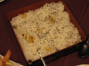 This level of jubako contained dried herring roe, white and pink fish cakes, ikura (salmon roe), mashed sweet potato, soy-glazed dried anchovies, Cool Breeze Amongst Pine Trees (Uichiro’s name for his famous meatloaf, don’t ask me how he came up with that name, some things are probably better unknown), and ham.