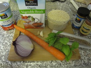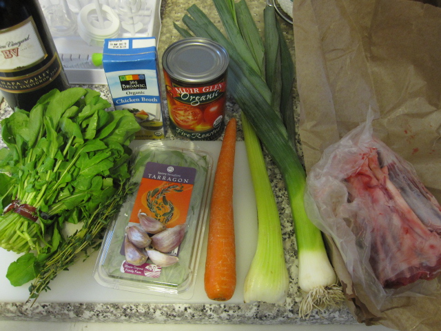I used 1/2 bunch of arugula, a few sprigs of fresh thyme, a few sprigs of fresh tarragon, 5 garlic cloves peeled, 1 carrot roughly chopped, 1 rib of celery roughly chopped, 1 leek sliced, 2 lamb shanks that each weighed about 3/4 lb, 1 cup of red wine, 3/4 cup of chicken stock, and a 14oz can of diced roasted tomatoes.