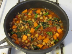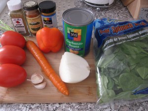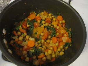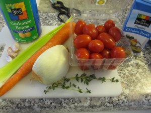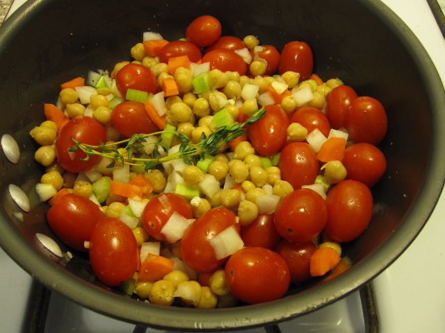 While the shanks were braising I threw together the sides. One was simmered chickpeas. I used a 14oz can of chickpeas, 3 garlic cloves minced, 1 rib of celery diced, 1 carrot diced, 1/4 onion diced, 10oz cherry tomatoes, a couple of thyme sprigs, and 1/4 cup of chicken stock.