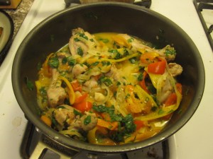 Then I poured in the wine and let it reduce by half, scraping up the little burnt bits stuck to the bottom of the pan. That’s where all of the flavor is. Once the wine was boiled down I added the tomatoes. After they came up to a boil I poured in the chicken stock and added the thyme. I seasoned with some salt and pepper and then put the shanks into the liquid. I covered the skillet, turned the heat down to med-low, and let it simmer for about 1.5 hours.
