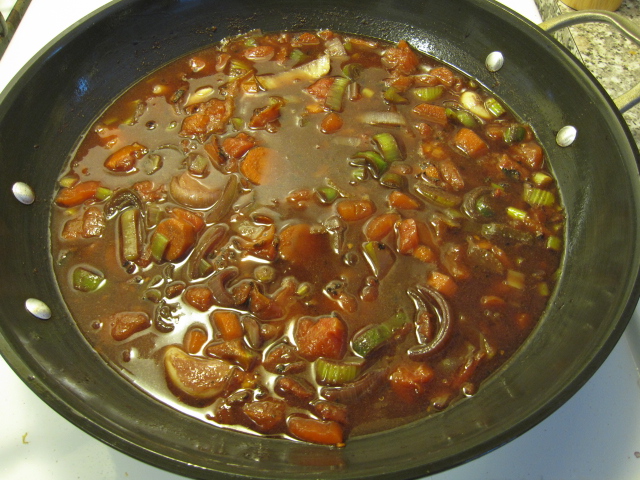 I put the carrot, celery, leek, and garlic in and let them sweat down for about 7 minutes. I wanted them to just start carmelizing to add their sweetness to the braising liquid.