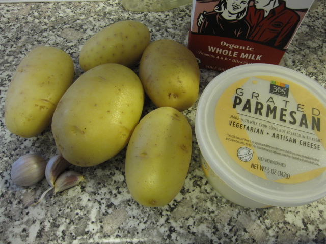 I put the potatoes and garlic into a pot with cold water, brought it up to a boil, and let it boil for about 20 minutes until the potatoes were soft. I poured out the water, added the milk and parmesan along with some salt and pepper, and mashed it all together.