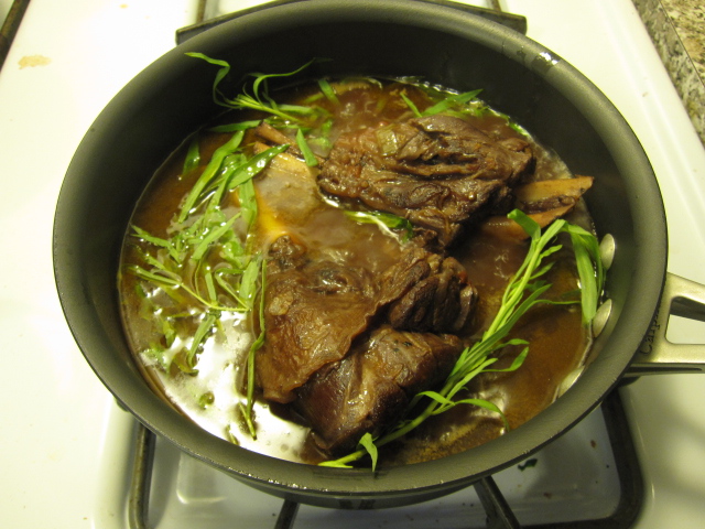 With the sides ready to go I finished up the shanks. I removed the shanks and put them into a smaller pan. Then, I strained the braising liquid. I discarded the solids and poured the liquid in the pan with the shanks. I brought it up to a boil and added the tarragon. I let it boil for about 15 minutes. This allowed the tarragon flavors to infuse into the liquid as well as reduce it by half.