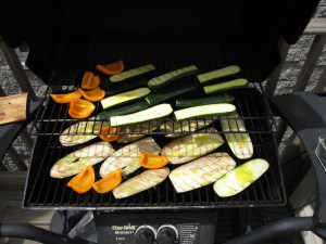 I started by thinly slicing a large eggplant and two smaller zucchini as well as two orange bell peppers. I drizzled them with olive oil and then grilled them until they were about half-way cooked.