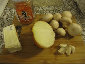 To make the spaghetti I used butter, the sake hogushi, half on onion sliced, 7 button mushrooms sliced, and 4 garlic cloves. In a large hot skillet I poured about 2 tablespoons of olive oil and then melted 1 tablespoon of butter in that. I added the onion and let it sweat for about 4 minutes. Then, I added the garlic and mushrooms. At the same time I cooked my noodles in boiling water until al dente. The garlic and mushrooms needed about 5 minutes which was about the same amount of time the noodles took. After draining the noodles (I reserved about 1/3 cup of the water) I added about 1/4 cup of soy sauce along with 1/2 cup of the sake hogushi to the onions, garlic, and mushrooms. I let the soy come to boil for about 2 minutes and then added the noodles and reserved water with some black pepper. I let the noodles coat with the sauce and most of the liquid boil off then turned off the heat and covered the skillet.