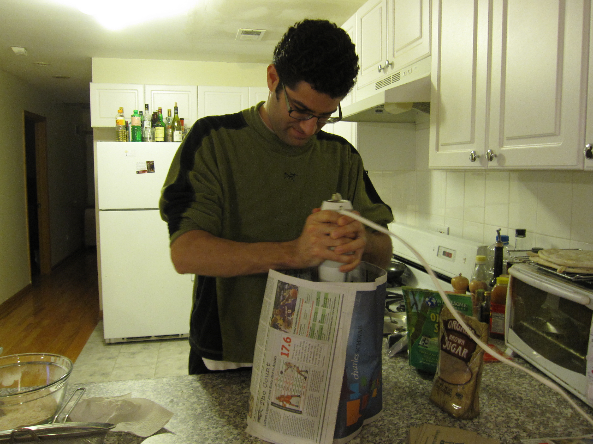 I started by mixing a half cup of room temperature butter with a quarter cup of cane sugar and a half cup of brown sugar until light and fluffy. Well, as light and fluffy as butter and sugar can get. My mixing bowl isn’t that large, so I always have to tape some newspaper together and build a wall around it to keep the sugar from flying everywhere. Yuki laughs at me, but not just because of that.