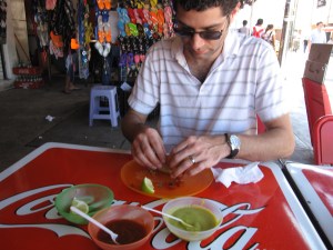 What we found in the pescado section was that none of the “restaurants” served fish ceviche. All of the camarones one could want, but no fish ceviche. One of the stalls was willing to make it for us though. So, they headed over to the fishmongers and grabbed a couple of fish for us. One was a snapper and the other was something else. I did see some baby hammerhead sharks at the fishmongers’ counter (don’t know why my older bro didn’t get a good photo of those as I didn’t have my camera with me, but he’s not as bright as I am, so we’ll give him a pass), and the other fish did have a sharky texture, but I’m not sure if it was shark or not.