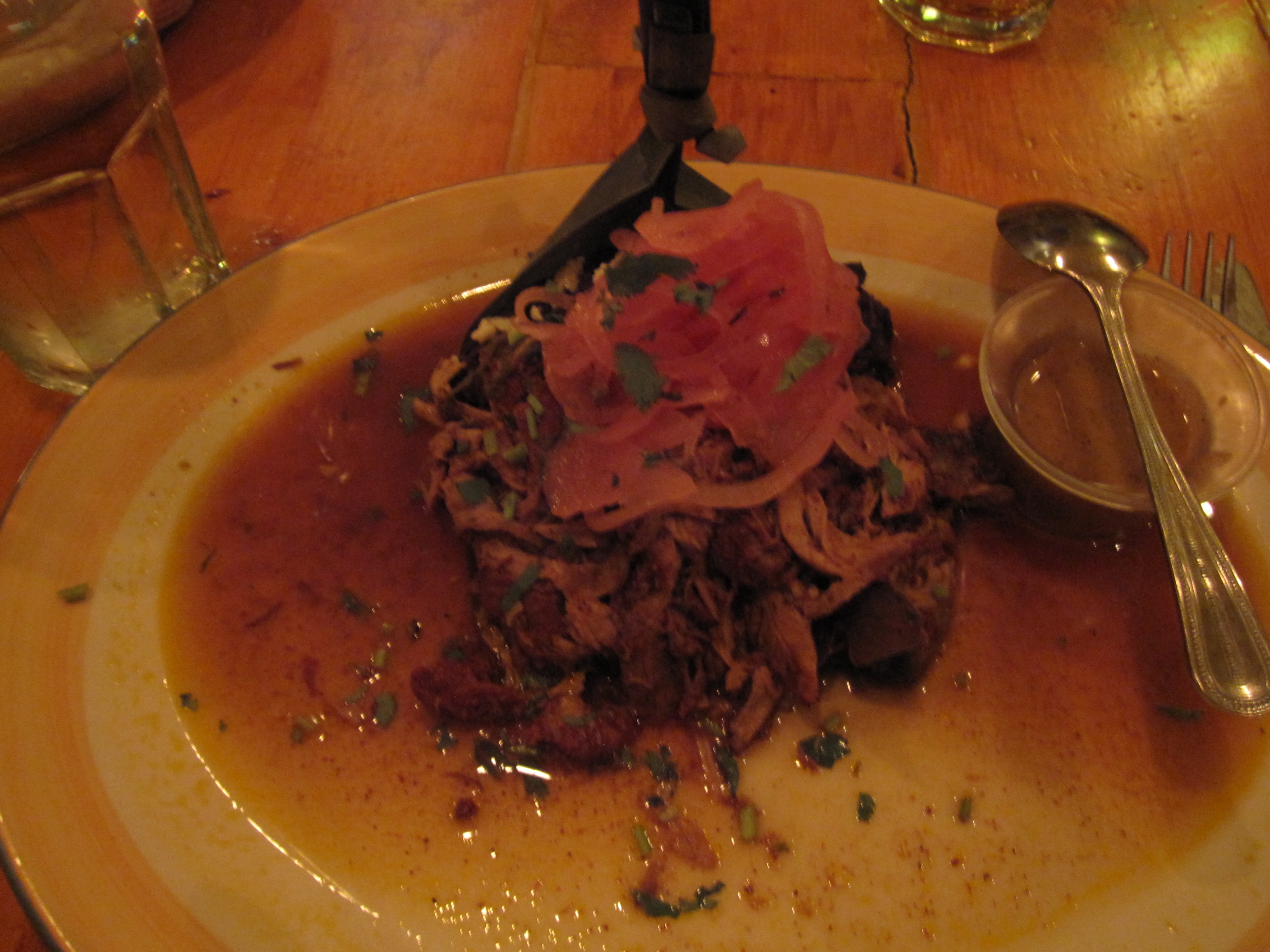 Ah, the piece de resistance! Yuki ordered the Cochinita Pibil. Slow cooked pork shoulder cooked in a banana leaf and served with black beans, pickled onions, and a spicy habanero salsa. This was one of the best pork dishes I have ever eaten in Chicago. If it were socially acceptable I would dress myself in cochinita pibil and prance about town. The pork was fall-apart tender full of flavor. The pickled onion just explodes in your mouth. The beans add substance. The habanero salsa was the perfect level of spice, a slow burn that coats your mouth but isn’t overpowering and makes you want to come back for more. This dish was truly impressive.