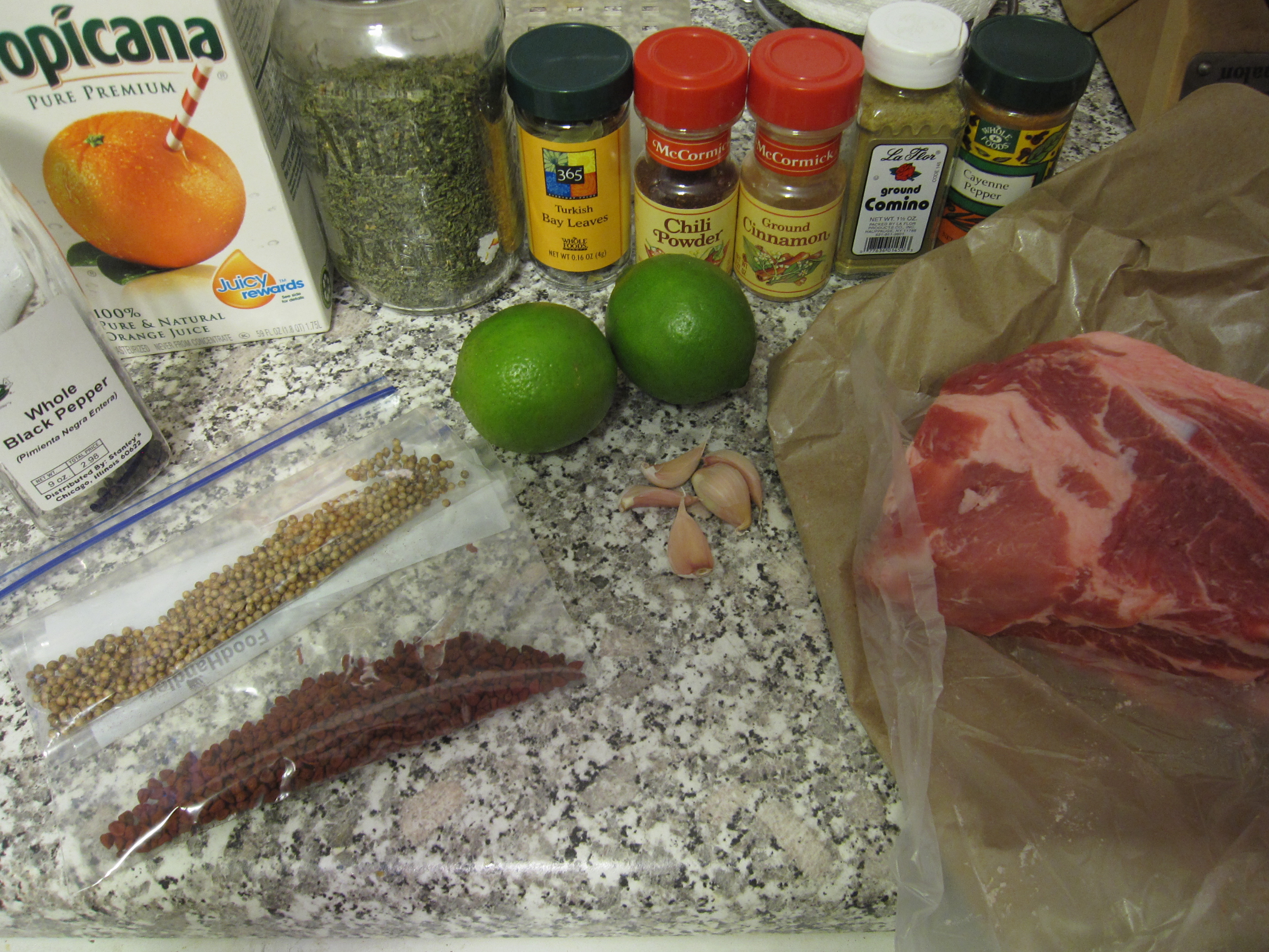 Alright, so I the shoulder I picked up weighed about 2.8 lbs, bone-in. Gotta be bone-in, there’s just no other way to go. For the marinade I crushed 2 tablespoons of achiote seeds with 1 teaspoon of coriander seeds. I found out the hard way that achiote seeds stain anything and everything. If you can find achiote past that’s a better alternative. Anyway, I mixed those in a large glass (must be a non-reactive material) bowl with 1 teaspoon each of dried oregano, chili powder, cinnamon, cumin, and cayenne. Then, I minced 5 garlic cloves, crushed up 2 bay leaves, and mixed those in. I cracked about 2 tablespoons of black pepper. Finally, I poured in 1 cup of orange juice and the juice of 2 limes. With a fork I pricked the shoulder all over, let it swim in the marinade, covered it with plastic wrap, and threw it in my fridge. This was about 2pm Monday so that I could get 24 hours of marinating time.