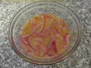 While the pork was braising I made my sides and condiments. I pickled a red onion, very easy to do and very delicious. Also, pickled red onion is the classic condiment to cochinita pibil. I quartered a red onion and then sliced each quarter into 1/8 inch slices then put them in this small glass bowl. I boiled some water and poured it on top of the onions. After ten minutes I drained the onions and put them back into the bowl. I mixed together 1/2 cup of orange juice with 1/2 cup of fresh squeezed lime juice and a pinch of salt and then poured that on top of the onions. I covered it with wrap and let it sit until dinner time.