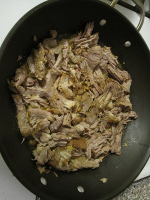 Once the pork was fall-off-the-bone deliciousness, I let it cool a little so that I could handle it without burning myself. Although, the pleasure of sinking my teeth into that meat would be worth the pain. Once I could handle it painlessly I pulled the meat and put it in a large skillet. I poured about 1/2-1/3 cup of the liquid in and then heated it back up.