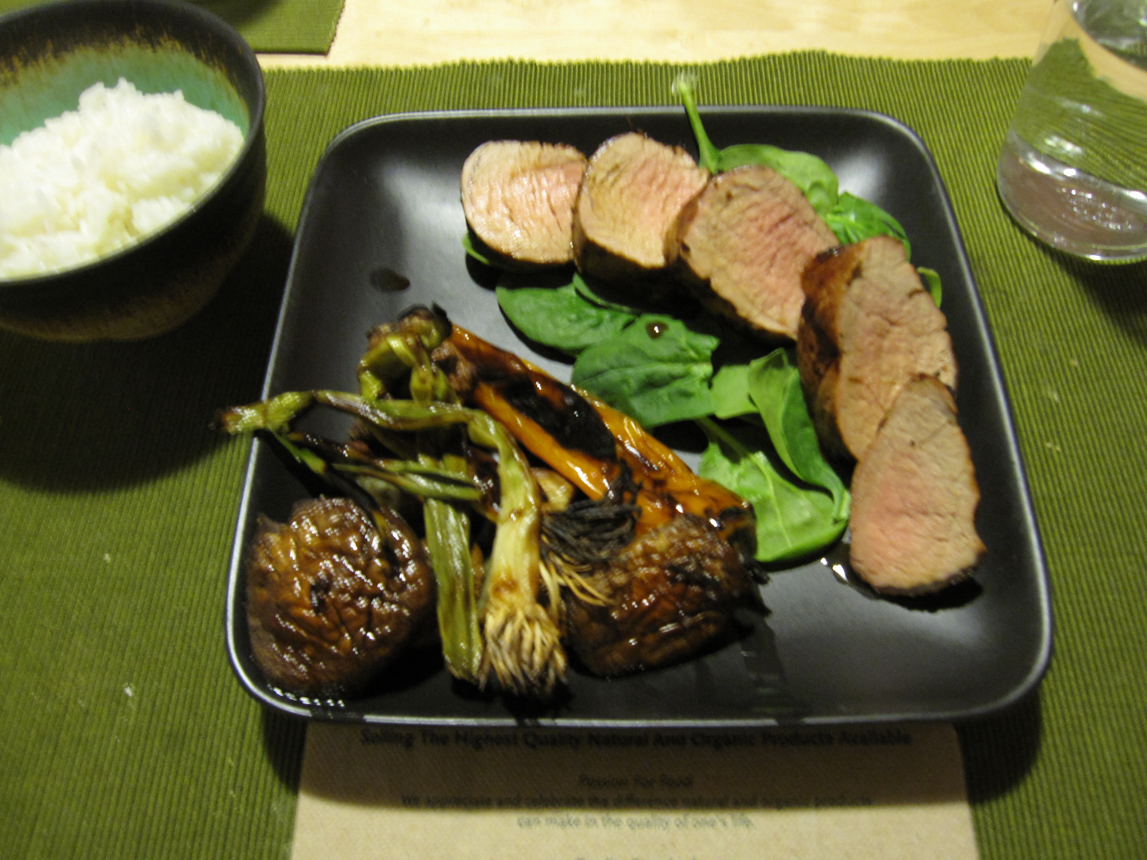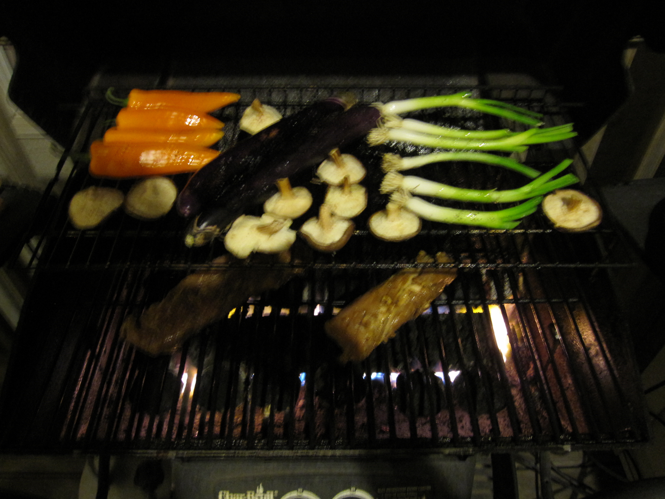 While the squash was simmering I marinate the pork in 1 tablespoon sesame oil, 3 tablespoons soy sauce, 2 tablespoons sake, 1 tablespoon mirin, 2 tablespoons apple cider vinegar, 1/2 inch of ginger grated, and 3 garlic cloves grated. I had 2 lbs of tenderloin and let it marinate in the fridge for about 2 hours, then let it sit out for about 45 minutes before grilling.