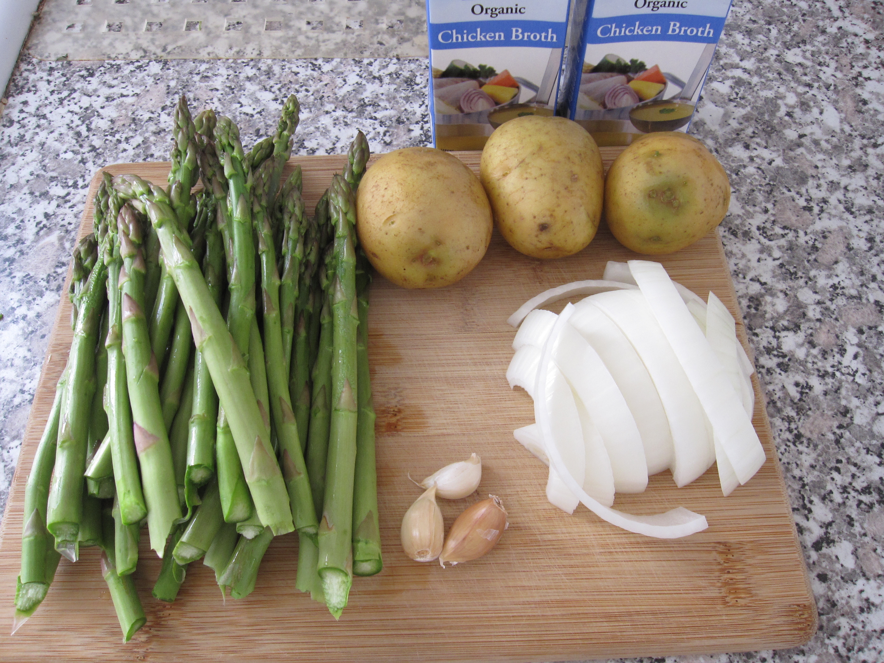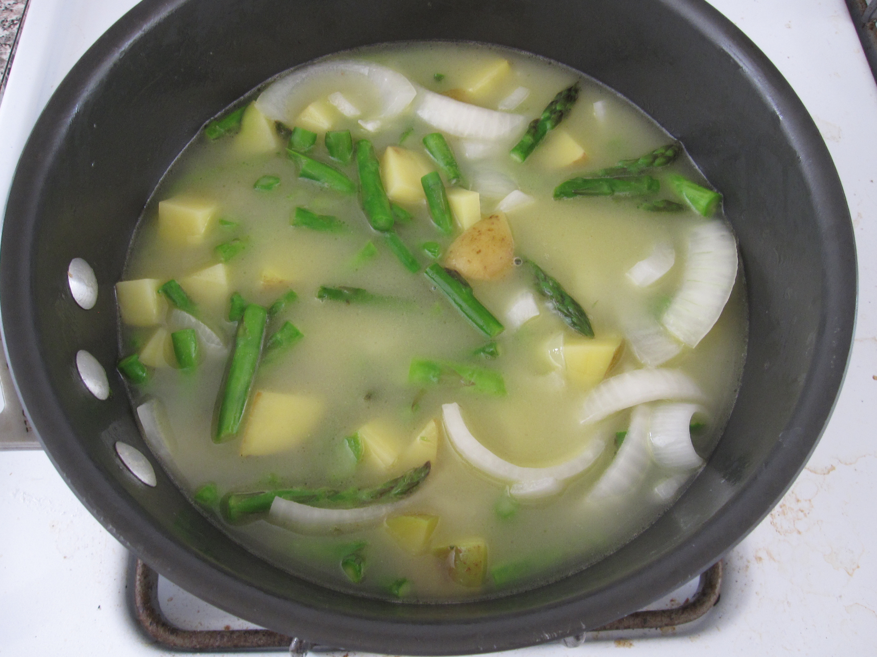 In a sauce pan, I threw all of the ingredients together and simmered them over medium-high heat for about 15 minutes, until everything was soft but not mushy. I let it cool down and then pureed it in my little blender. I set about 5 tablespoons aside and then salted and peppered the rest and let that sit aside ready to reheat just before serving.