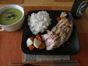 I had a half of a butternut squash in my fridge that I wanted to use up last night. The first thing that popped into my head was a puree. Squash puree’s really well, especially when you add a little ginger and garlic. So, Otis and I walked down to Trader Joe’s and grabbed some pork tenderloin to grill up for the protein.