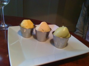 This other dessert was written on the menu as Satuma Chiboust with campari, pineapple, semolina and zingerman cheese ice cream. What? I know that Chiboust is a type of cream used in pastries, but what on Earth is Satuma? I can only hope they meant Satsuma which is a citrus…or a city in Japan. I’ll go with citrus. This dessert wasn’t bad though, even though they can’t spell.