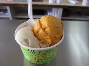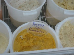 In this box there was some simple steamed pea pods, shiitake simmered in shoyu (Japanese soy sauce), boiled satoimo potatoes, simmered lotus root, simmered carrots, and koya tofu (freeze-dried tofu, something I’ve never eaten before but really like the texture).