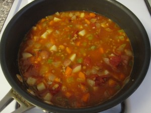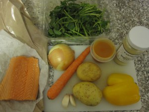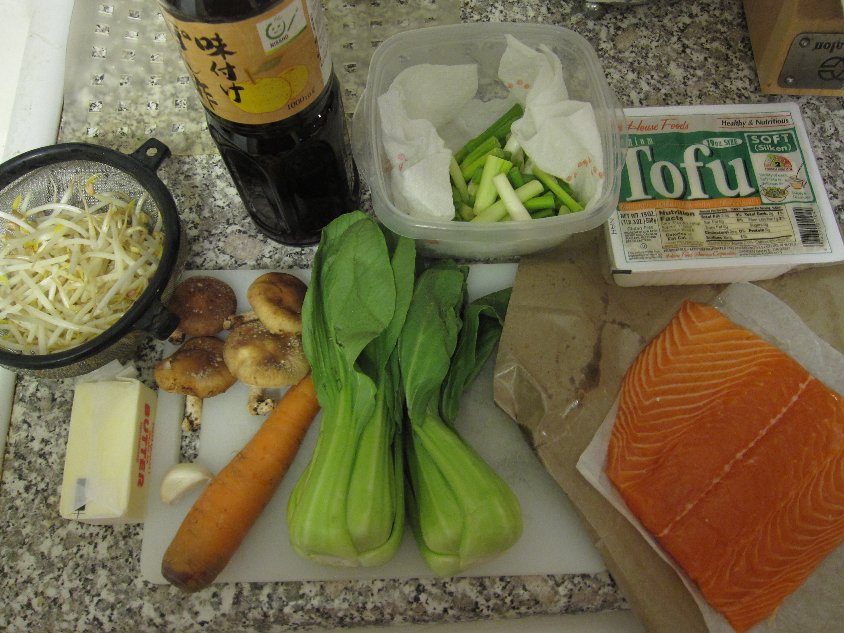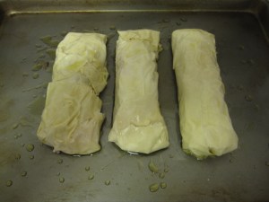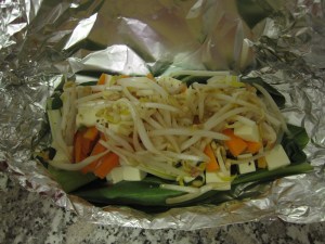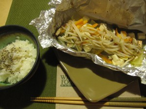 In this box there was some simple steamed pea pods, shiitake simmered in shoyu (Japanese soy sauce), boiled satoimo potatoes, simmered lotus root, simmered carrots, and koya tofu (freeze-dried tofu, something I’ve never eaten before but really like the texture).